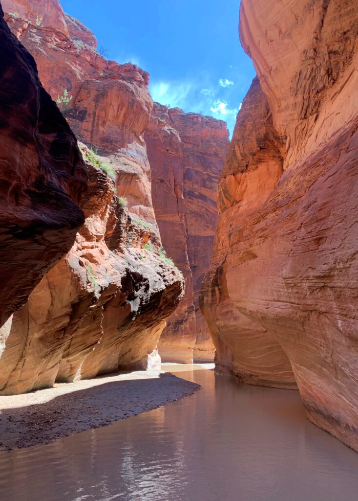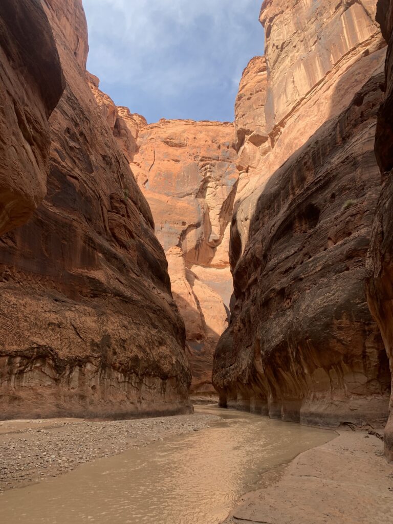 The water situation was actually better than I’d been led to believe. Parts of the Gulch were just muddy with no standing water. The deeper sections were thigh deep and just a few cold stretches just over my belly button. It was simply astounding to see the high-water marks as evidenced by the log jams stuck high up on the slot canyon walls.