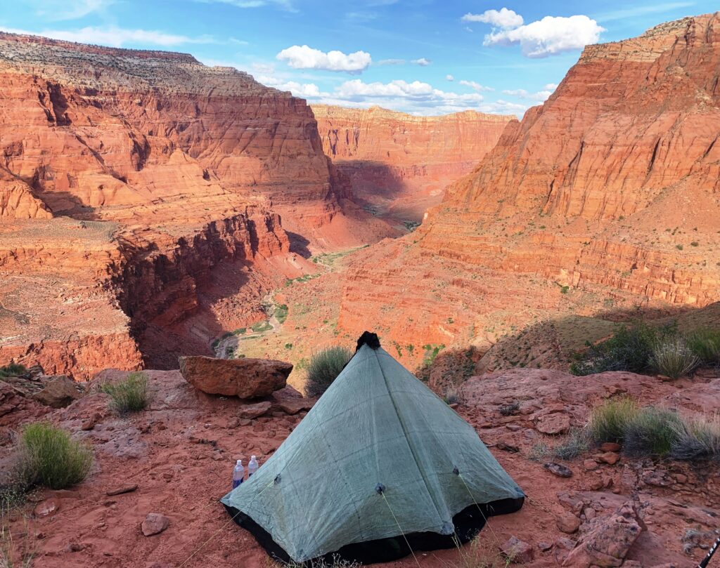 As expected, this was a very steep and scree-filled route with many sandstone cliff bands to navigate. On one ten-foot band, I had to climb up without my pack and hoist it up behind me. About 3/4 of the way up on top of another cliff band, I found a semi-level flat spot large enough for my tent. What spectacular views! Could have probably made it to the top before dark but I made the right decision. I’ll tackle the rest of the way up tomorrow with fresher legs.