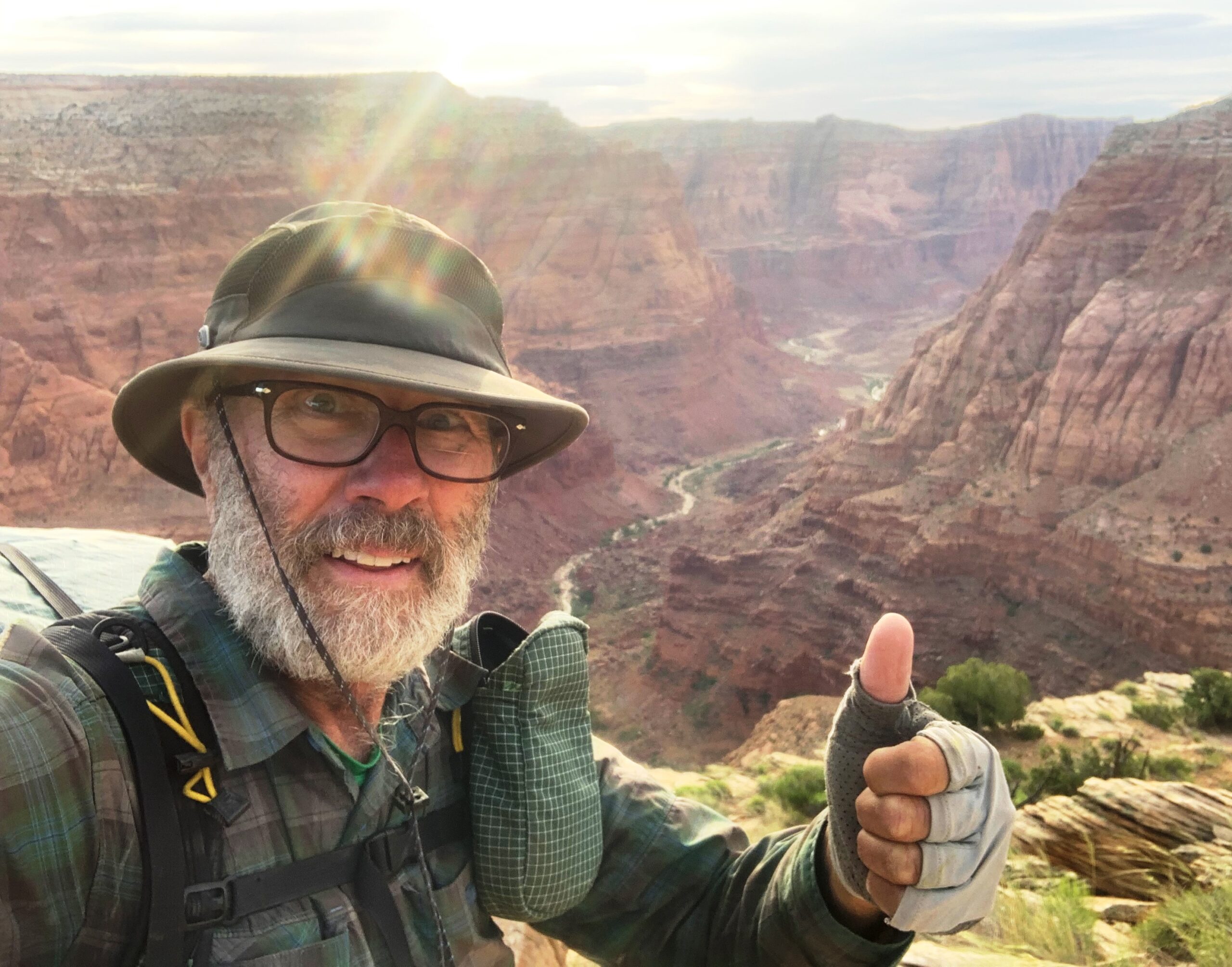 Summit bid! The remaining climb up to Bush Head and the Paria Plateau was even steeper than yesterday. Just tried to find the path of least resistance and kept reminding myself about three points of contact. Hiking poles were extra baggage at this point. A few false summits but finally cleared the last sandstone cliff band and this old man did another happy dance!