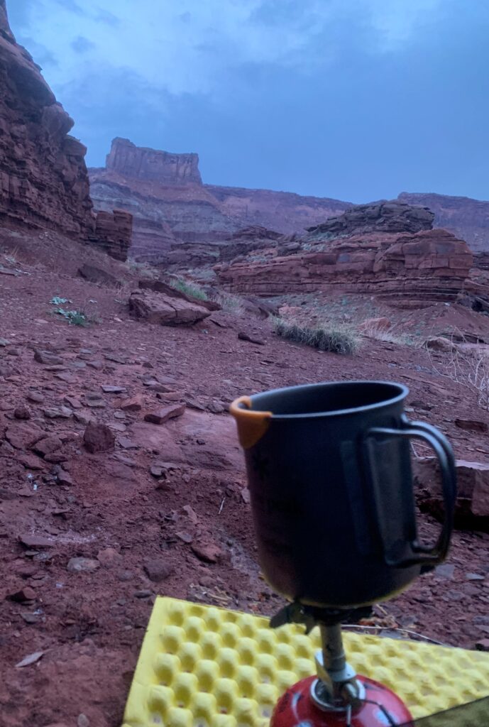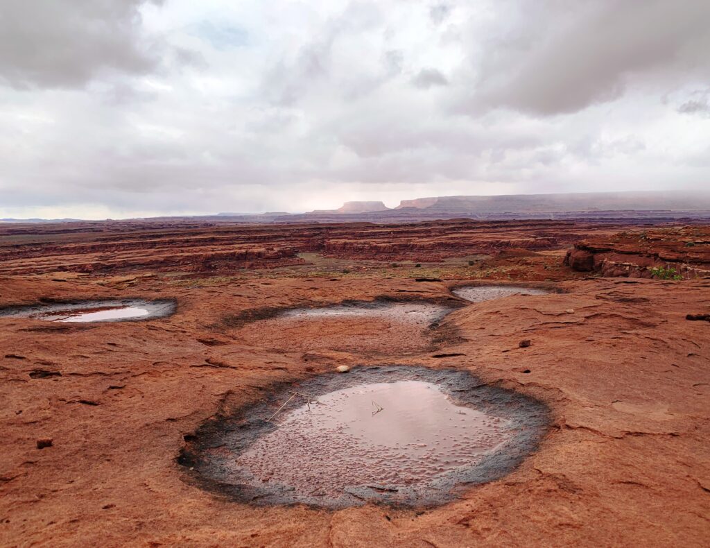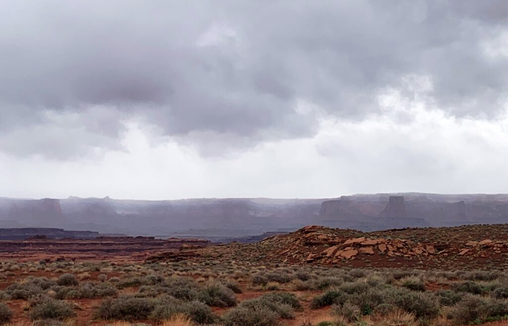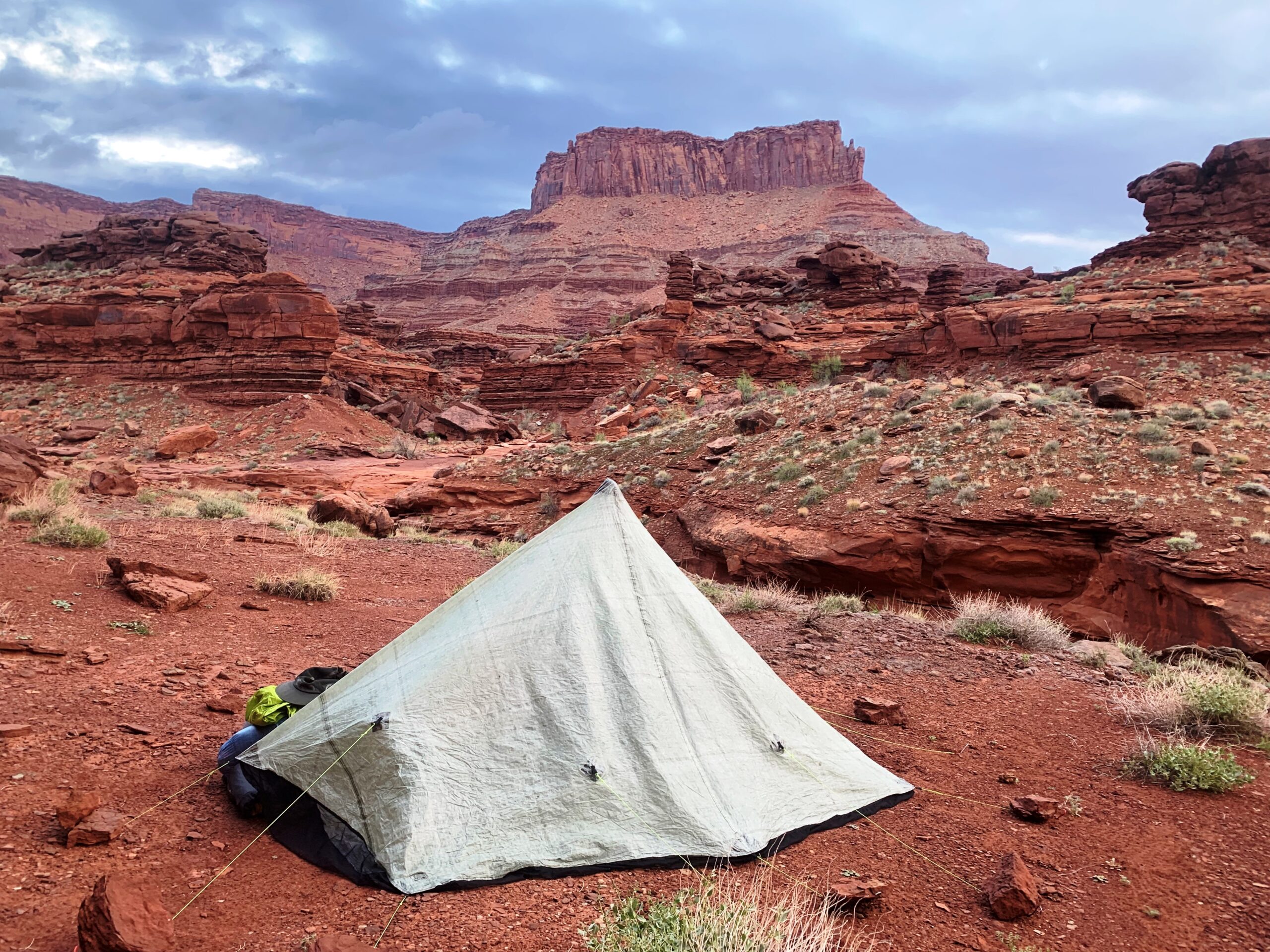 I headed back out of the wash and got water at a seep – too alkaline to drink much. Back to Lockhart Road, I continued south between the canyons and bluffs. I had to find a few overhangs in the bluffs to escape rain and snow flurries. Hung my tent over my head for extra protection and warmth.