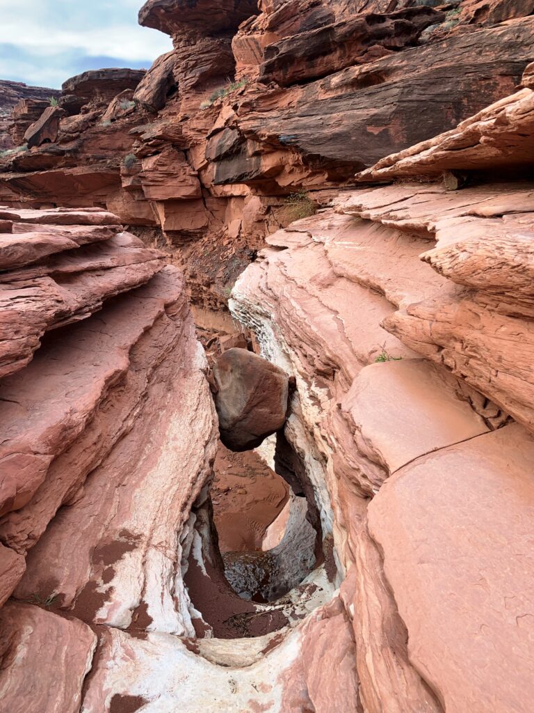Just as I was getting up for an early start, more snow flurries. Laid my head down for another 30 minutes, then off and running. Well, actually trudging down Rustler Canyon. Got to the big 50′ pouroff into Indian Canyon and looked on the south side for the way down.