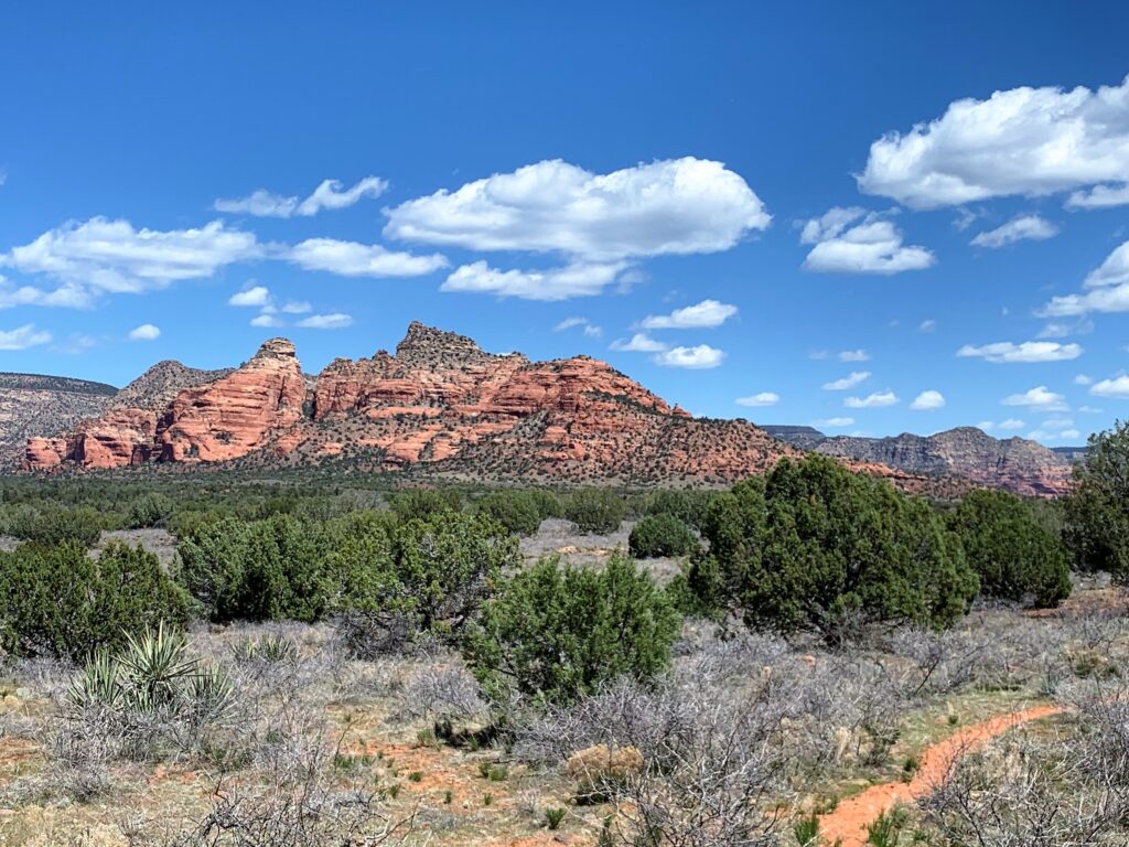 While crossing Packard Mesa on mostly cow trails, I soon got my first good peek of Red Rock country. And in the distance to the north, San Francisco Peaks near Flagstaff.