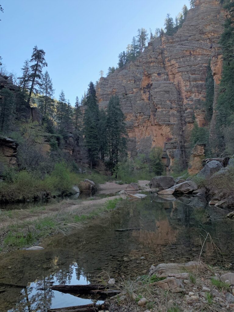 Pine Creek was flowing well and I got great water at Parsnip Spring. Great views of the Rim, Pine Canyon and now, from my tent, the community of Pine.