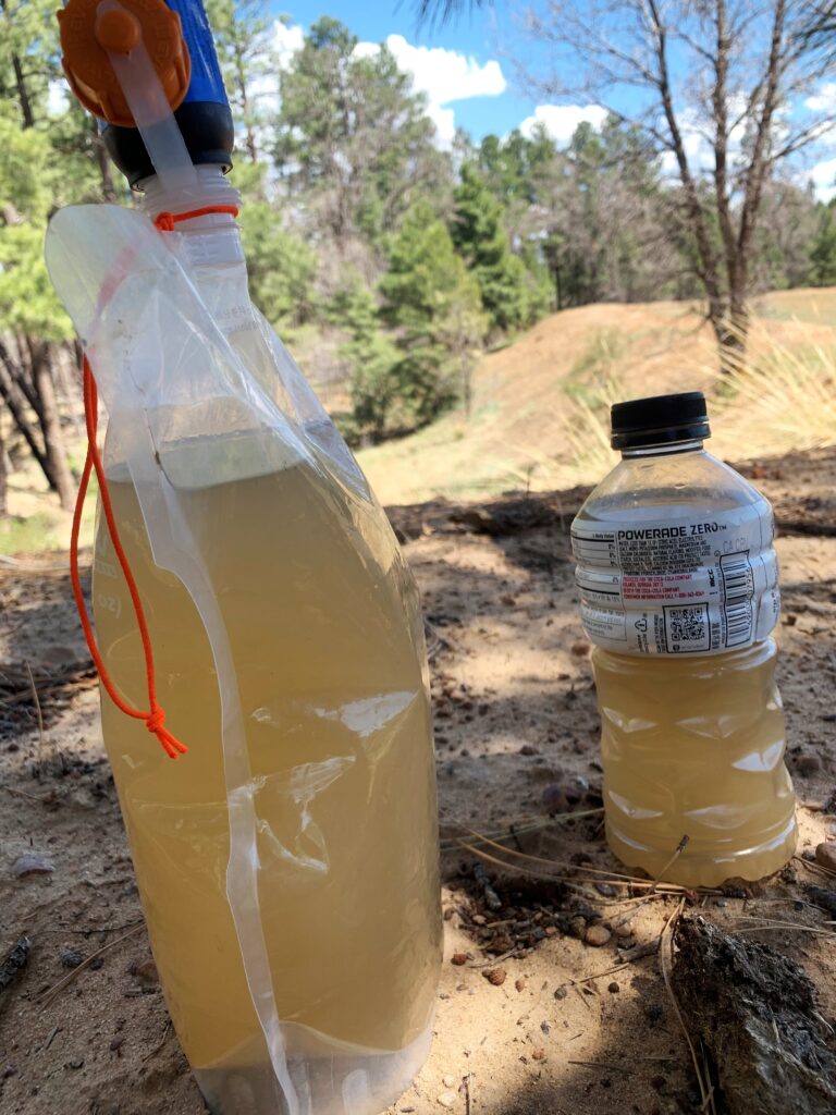 I made it to Fence Lake late in the afternoon, now reduced to two, big, silty puddles, animal tracks and poop everywhere. Beggars can’t be choosers – I filtered two liters.