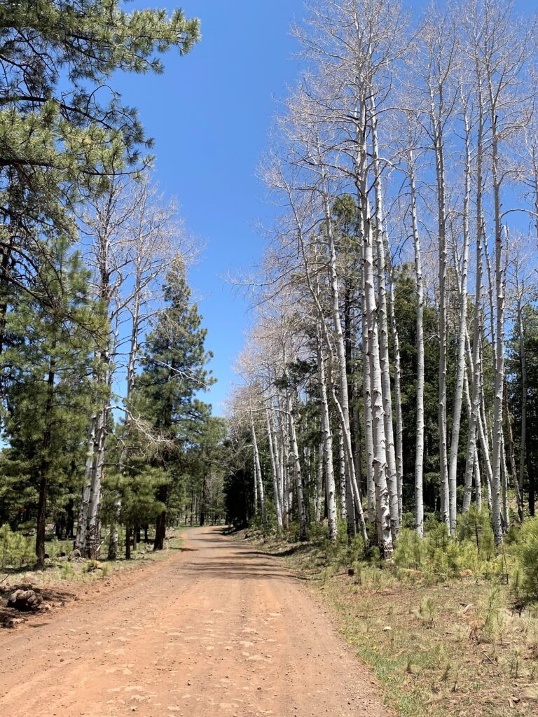 Another mostly gentle climb through the Sitgreaves NF in the White Mountains Trail System and on dirt roads. Quite a bit of evidence of recent forest thinning, selective logging and even walked through a controlled burn area. I thought the burn was done but was soon walking near burning and smoking undergrowth. I didn’t see anyone actually “controlling” this burn.