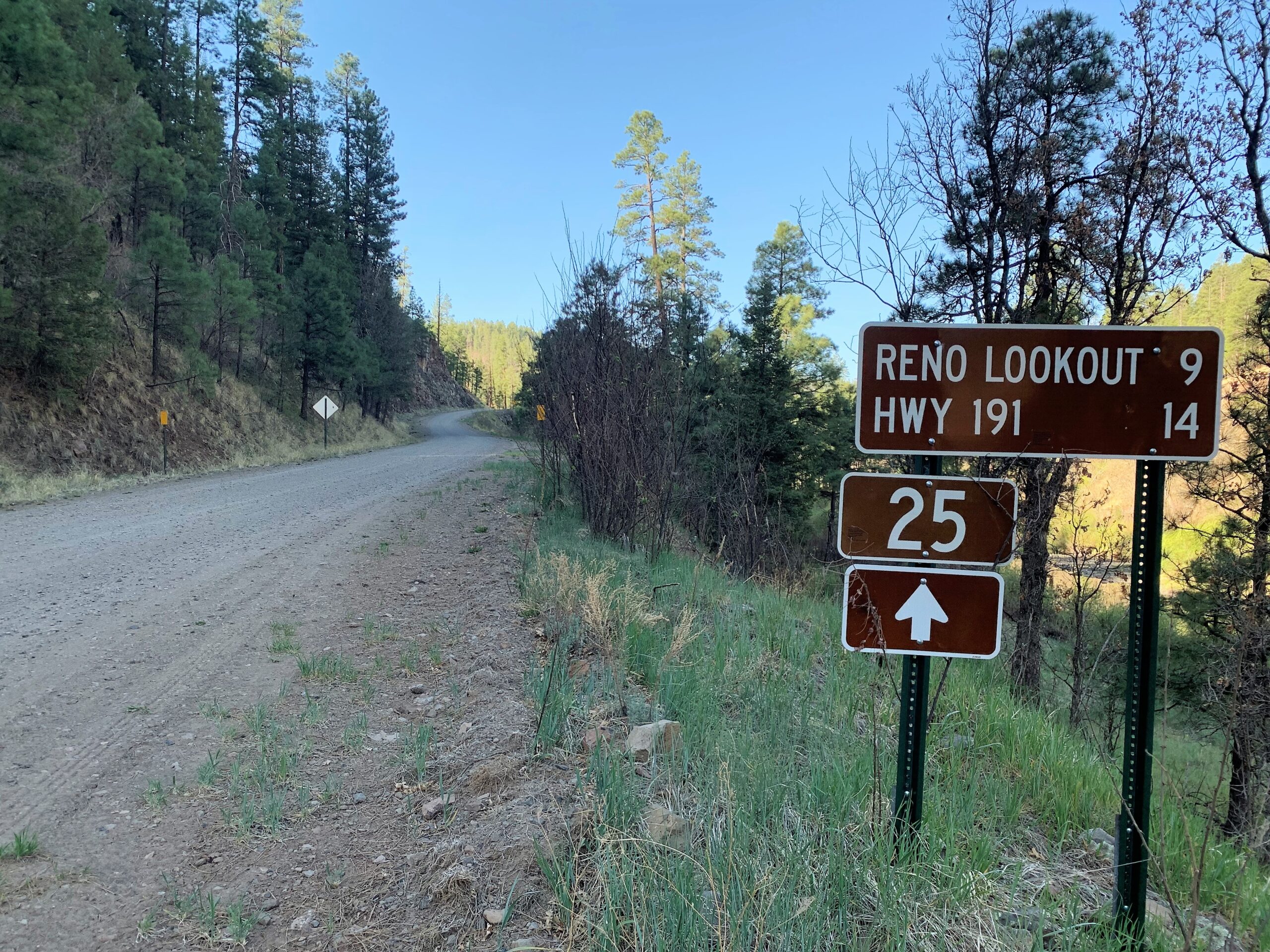 Highway 191, part of the Coronado Trail Scenic Byway, is a lonely highway. I learned that on crossing it further south on the GET in 2018. I had made an “ALPINE” sign for hitching and took it out. Only two cars went by in the right direction in the first 45 minutes. Then a truck pulled off of FR25 onto the highway, picked me up and took me straight to the motel. Good start on laundry and cleanup but no restaurants open on Sunday night. Oh well, I have a leftover trail meal.