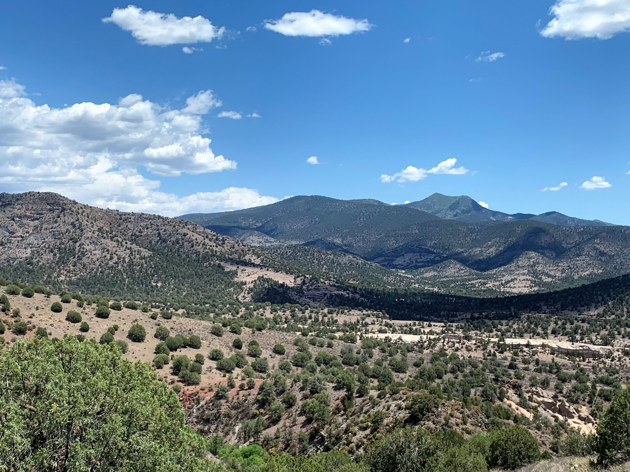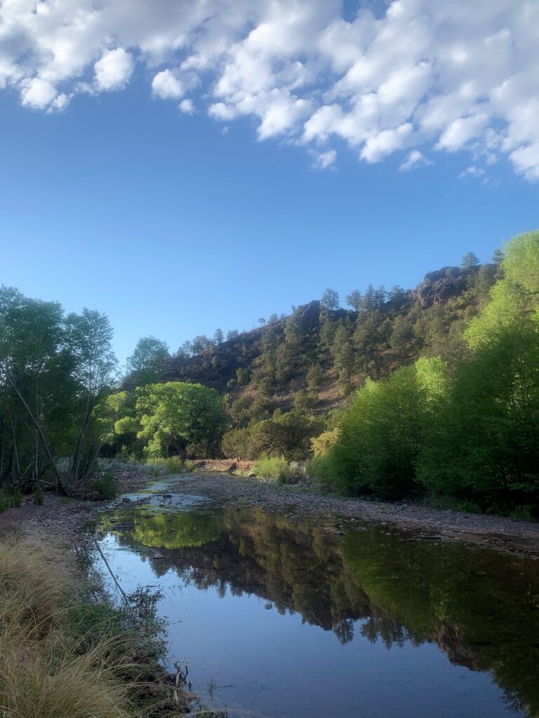 I followed the Blue River downstream for about five miles, either on the riverbank or on cattle trails. Crossed the river many times with just enough stepping stones to keep my shoes mostly dry. Scared up a few cows along the way. Turned east into Ladrone Canyon, heavily shaded and the creek flowing well. The final few miles uphill then downhill to connect with the MRT at Auger Creek Spring were more difficult – lost the trail a few times.