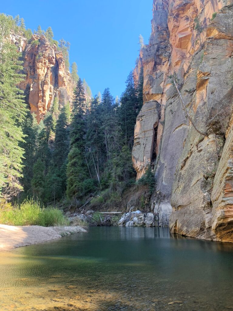 I worked my way down the steep and rocky Tramway Trail. Very impressive views of the deep pools at the bottom and sheer cliff walls. I recovered a bit at the bottom and chatted with the first people I have seen today. I then walked and waded downstream for about 0.6 miles before finding a campsite I couldn’t pass up. First task was to filter water and drink up!
