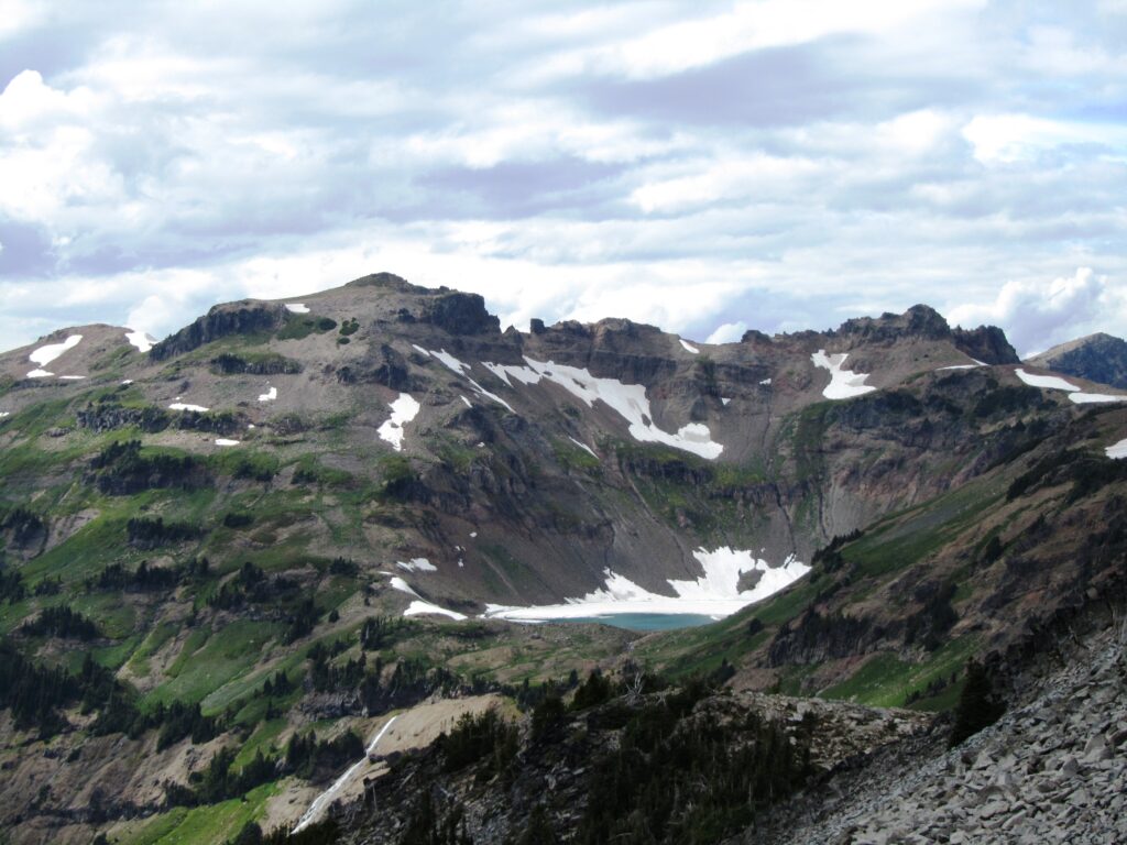 The jagged, snowy Goat Rocks and several glaciers, cascading waterfalls and icy lakes.