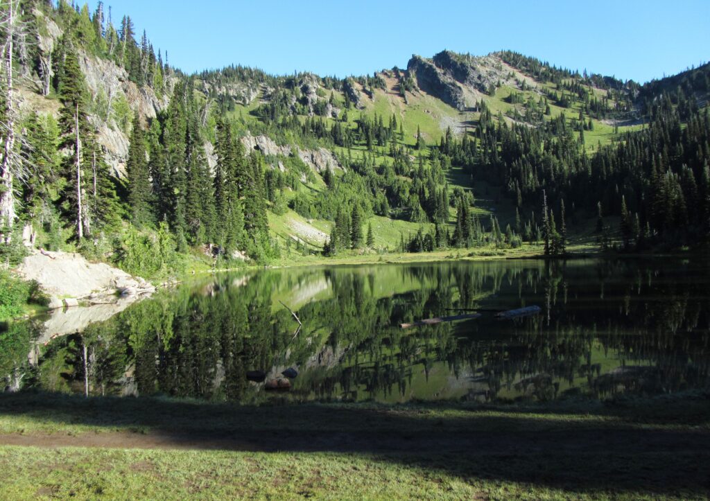 The trail today was about following contours, usually high up the ridge with good views. I passed Sheep Lake and then up to Sourdough Gap and Pickhandle Gap with views of the eastern side and top of Rainier and back to Mt Adams.