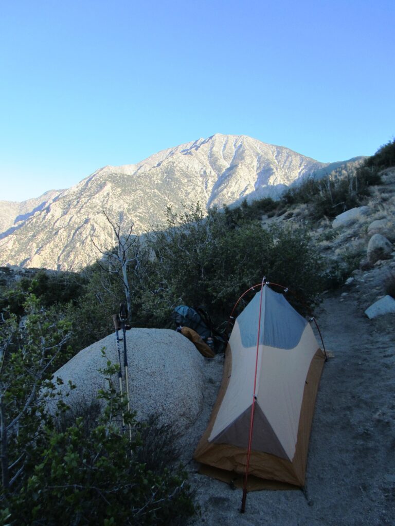 I’m dry camping on a high ridge above I-10 and the Mesa Wind Farm far below. Starting to get a great view of San Gorgonio Peak to the north at 11,499 ft.