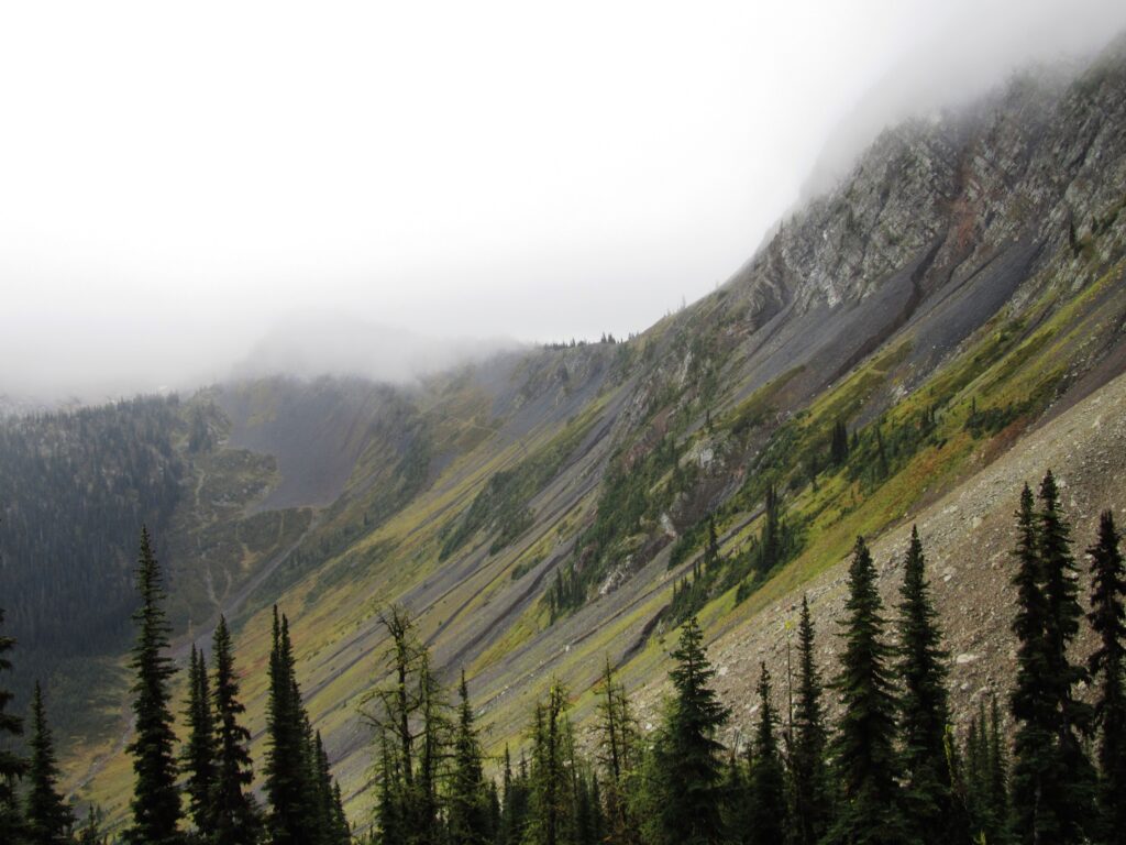 A quick descent to Holman Pass then a climb to Rock Pass, in the clouds most of the way. The trail switchbacked a few times then leveled off across a very steep talus slope towards Woody Pass.