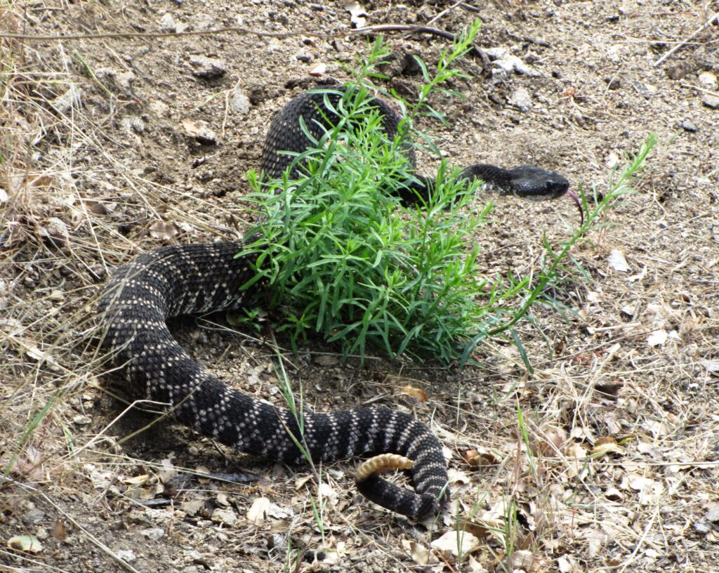 A mile further down the trail, I found a rattler stretched completely across the trail and not moving. He only continuing his journey after I prodded him with a hiking pole.