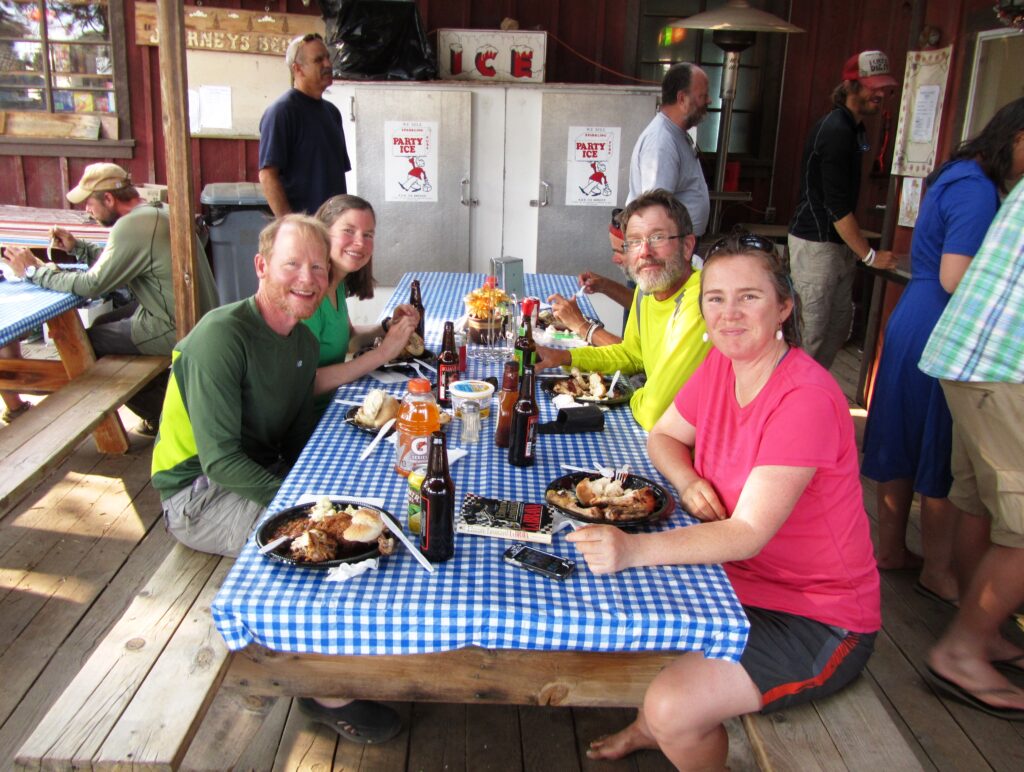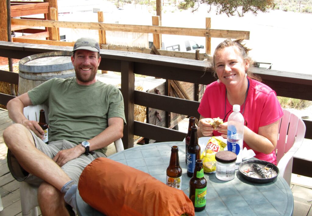 The owners let hikers camp nearby so we can spend more at the store and cafe and it worked today – breakfast, Gatorade, soda, cheeseburger for lunch, a few beers in the afternoon, ice cream (OK, it was hot), and a sit-down special chicken and potato salad dinner complete with cake and more ice cream.