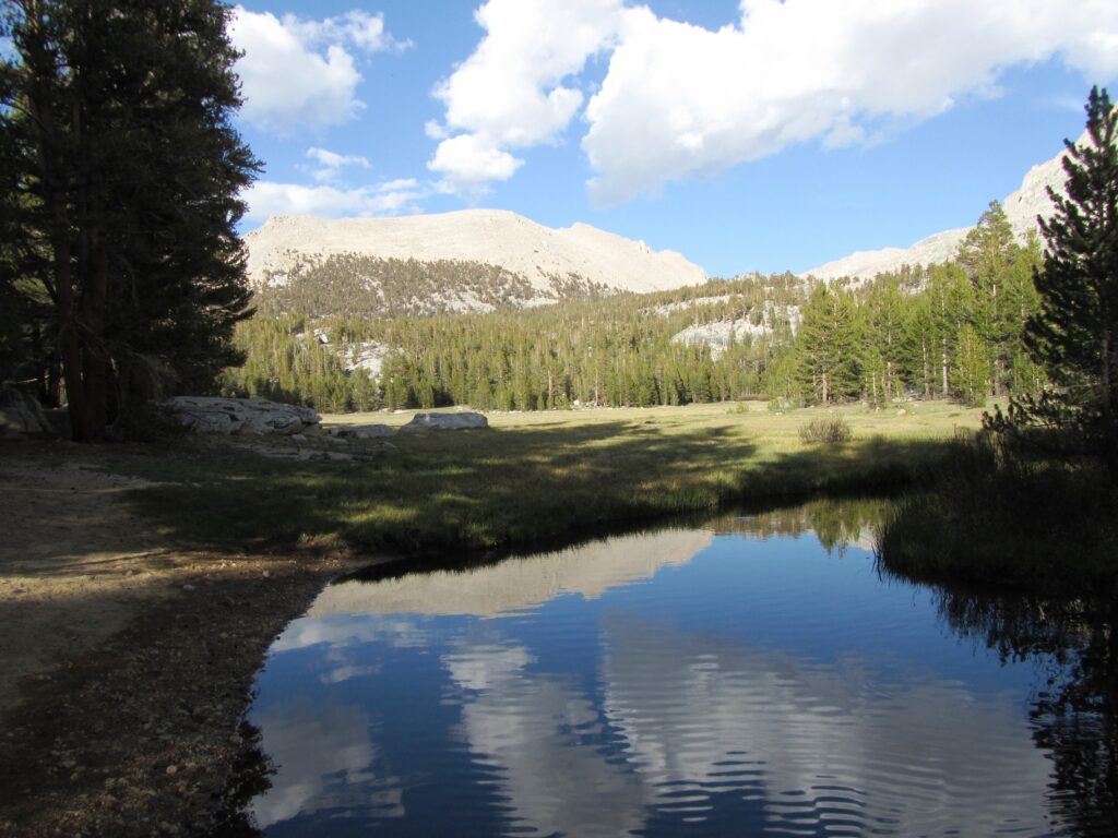 Beautiful campsite on the edge of the meadow along Whitney Creek full of golden trout.