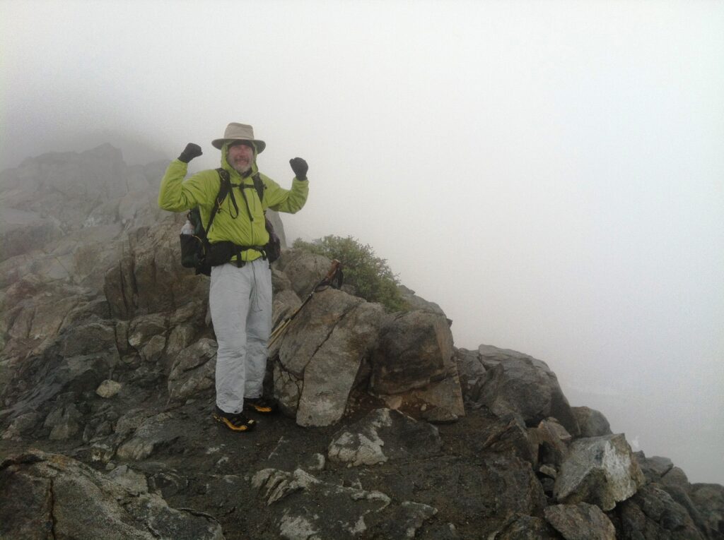 Before we even got back to the PCT junction, it started to snow and visibility decreased. I put on the rain pants and rain jacket and kept going over Glenn Pass at 11,978 ft.