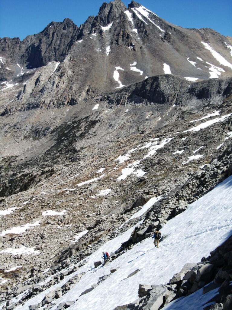 We hiked five miles up the headwaters of the South Fork Kings River and started the ascent of the rock wall called Mathers Pass at 12,100 ft. The south side was relatively free of snow.