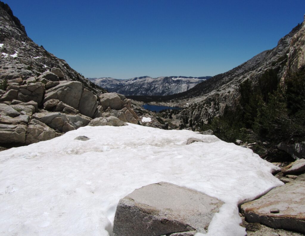 After a few miles, we started up Seldon Pass at 10,910 ft by way of pretty Sally Keyes Lake. While eating lunch at the pass, the same hiker from Muir Pass arrived wanting another naked photo shoot. This time only with her backpack on, a volunteer took her camera and obliged.