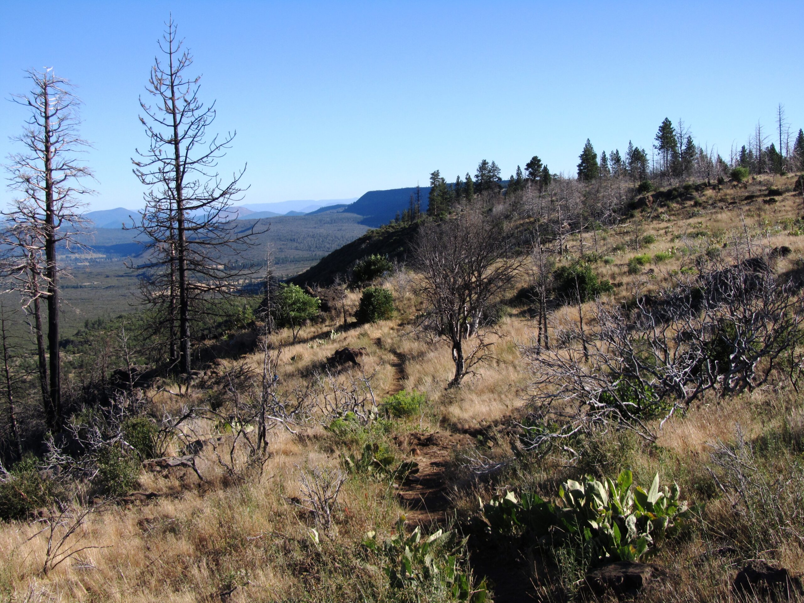 Very little shade today due to burns and a sparse forest. The trail stayed mostly on the edge of the rim so could see evidence of volcanic action including old lava flows.