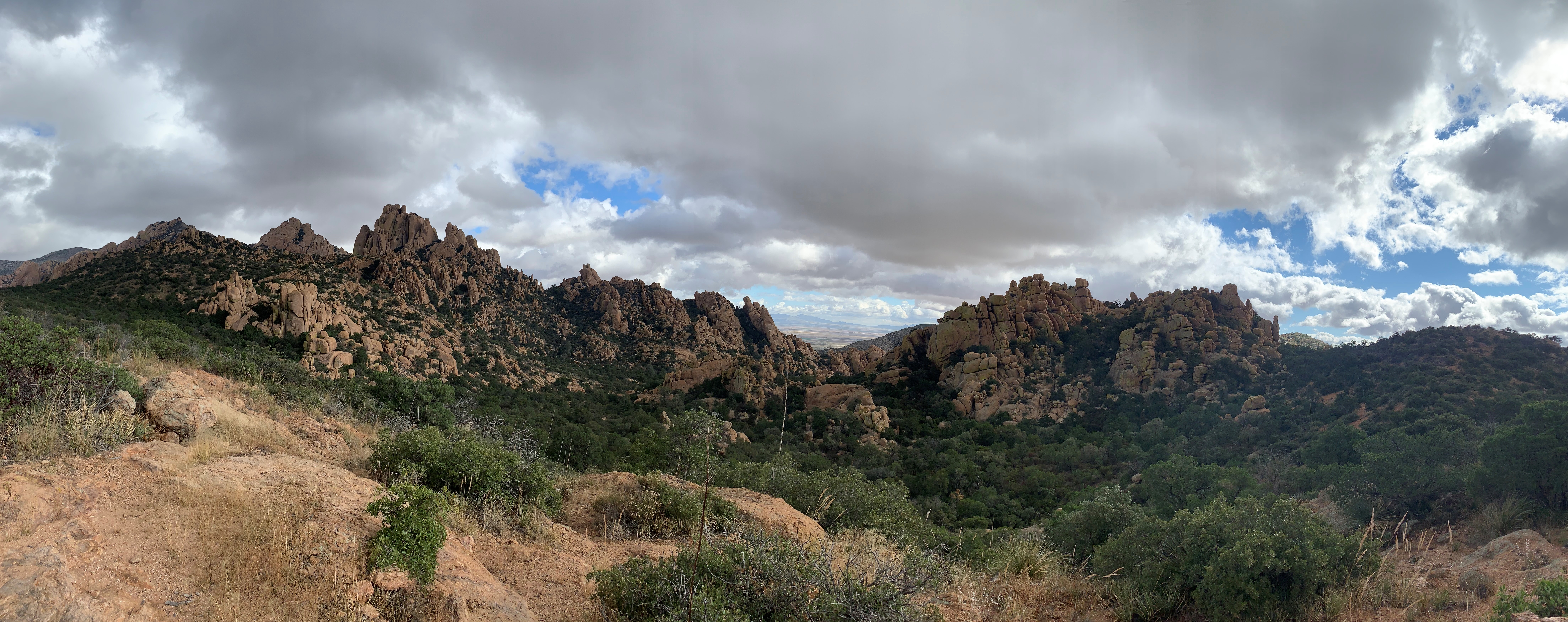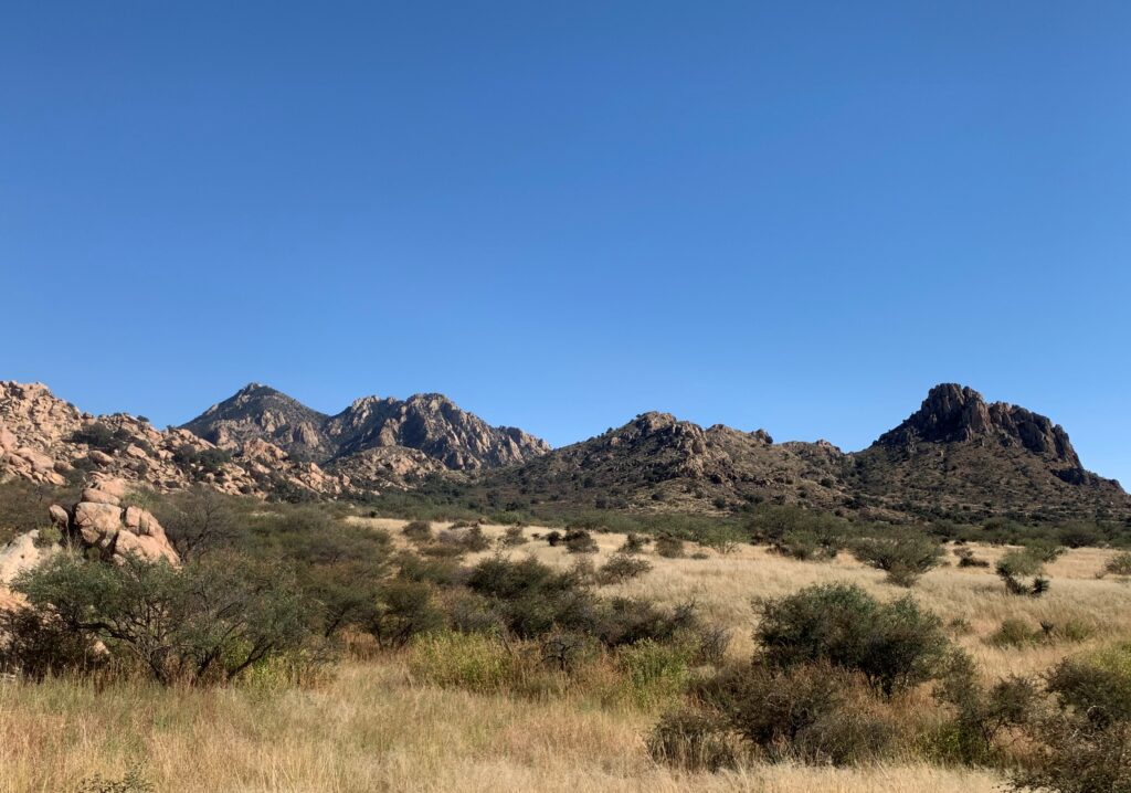 On the west side of the Dragoons, I hiked about three miles along the base of the picturesque mountains. Some on game trails but mostly in high grass, fighting through blood-letting cat claw bushes. Not fun but kind of expected.