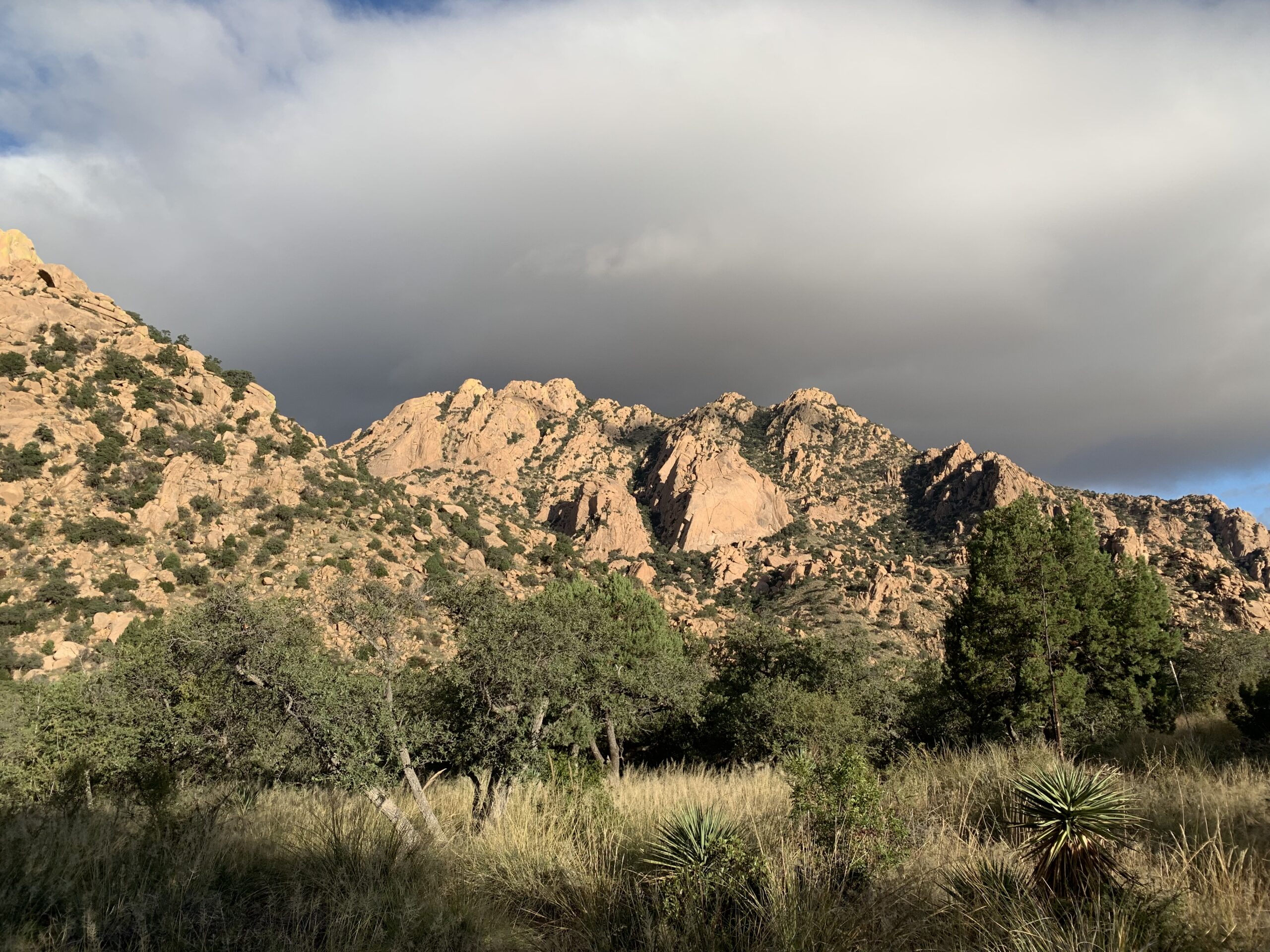 On the west side of the Dragoons, I hiked about three miles along the base of the picturesque mountains. Some on game trails but mostly in high grass, fighting through blood-letting cat claw bushes. Not fun but kind of expected.