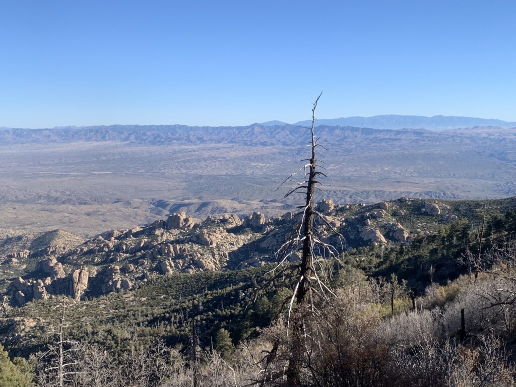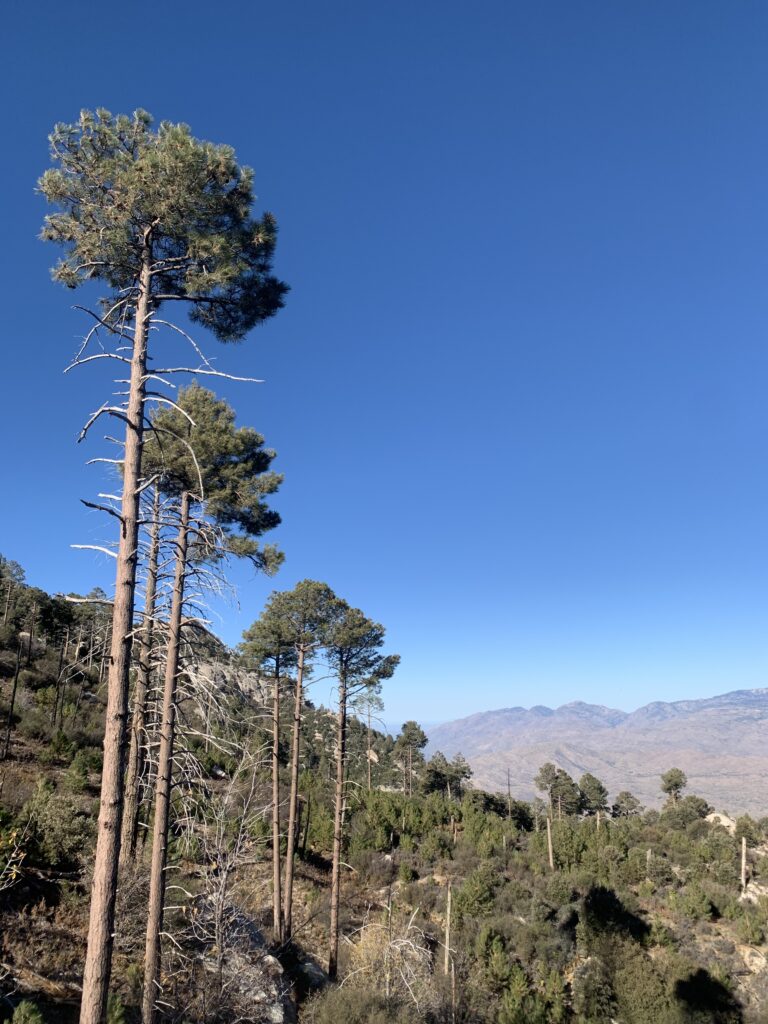 A bit more of a climb towards Mica Mountain warmed me up, then over the top and down the north slope of the Rincons with the Catalinas in full view. I hiked this section last spring and was hiking in snow. I saw a couple of whitetail deer – probably escaping hunting season by staying inside the Park.